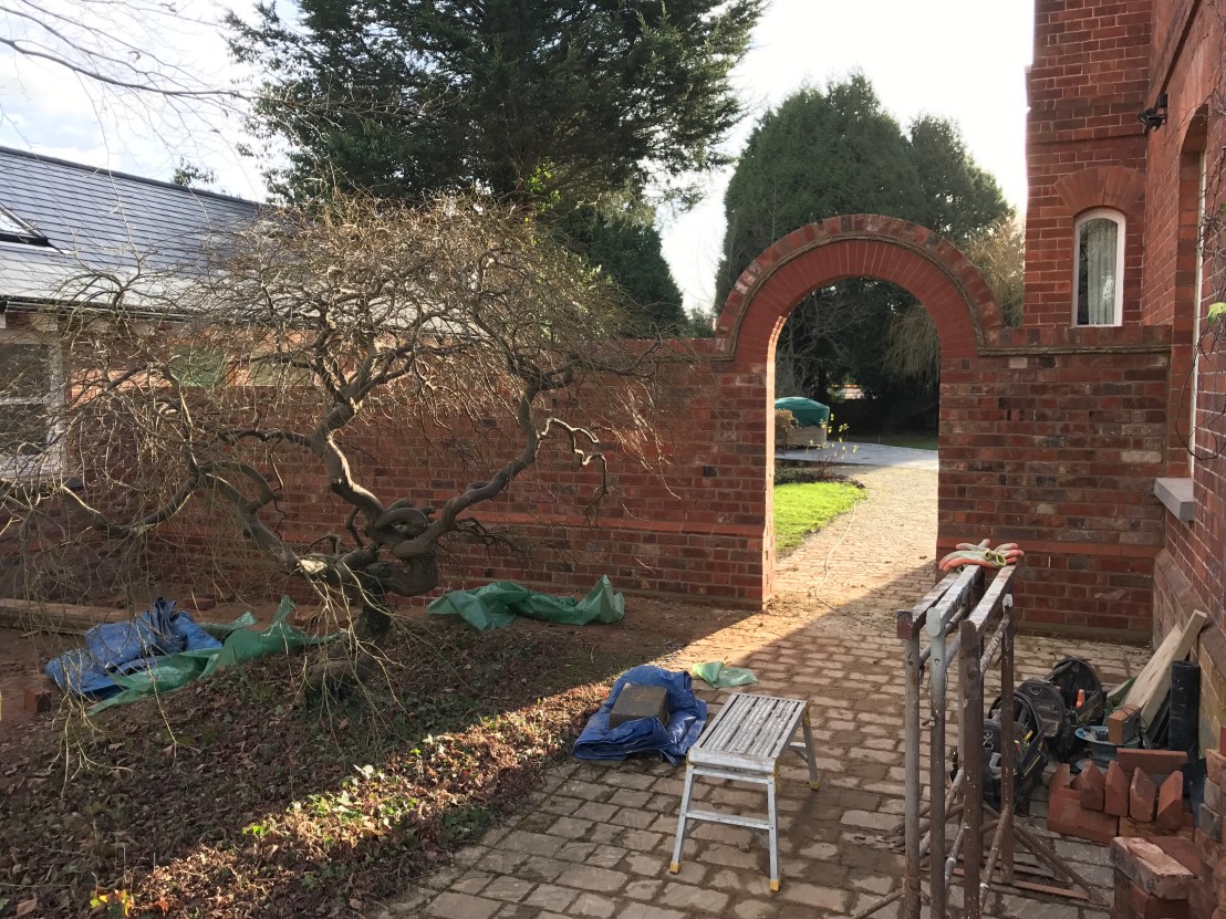 We have just finished a wall in Tunbridge wells, using bricks from the old town hall in Southborough. It’s built using “Flemish” bond, weather struck pointing and a decorative arch.